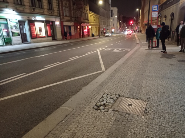 Na chodníku v ulici Husitská se na úrovni zastávky Tachovské náměstí směr centrum nachází rozpadlá dlažba.