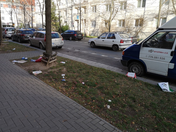 V ulici jeseniova u vš kolejí. Hromada odpadků na zemi