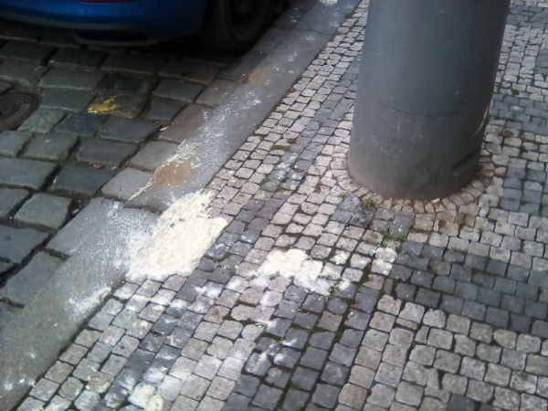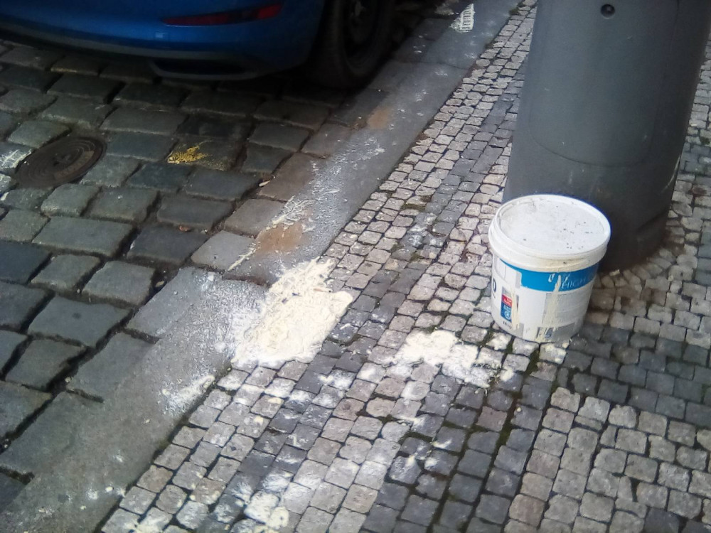 děkujeme za Váš podnět. Kbelík jsme odvezli. Na vyčištění chodníku předáme zodpovědné firmě. Barva musí také zaschnout. Okolo parkují auta a ani teploty nejsou nyní na mytí.