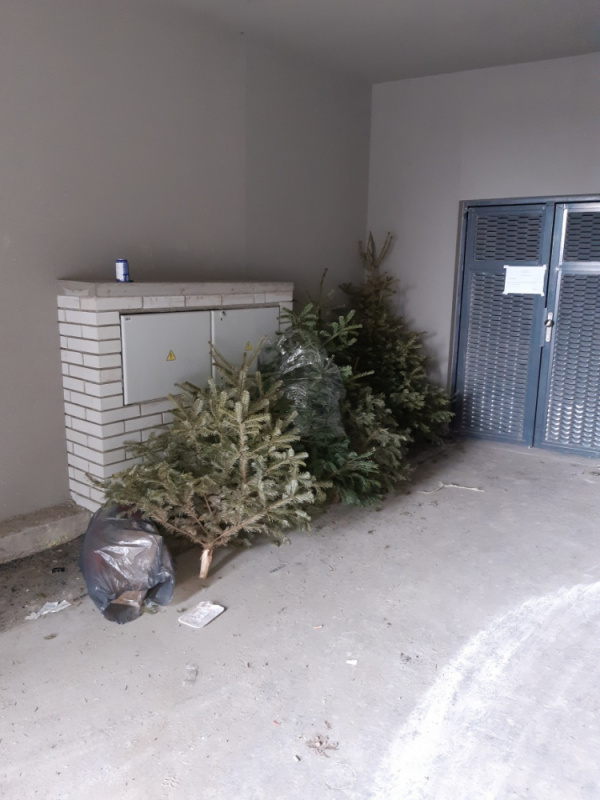 Vyhozené vánoční stromky před umístěním kontejnerů a hned vedle vyhozené odpadky.Děkuji