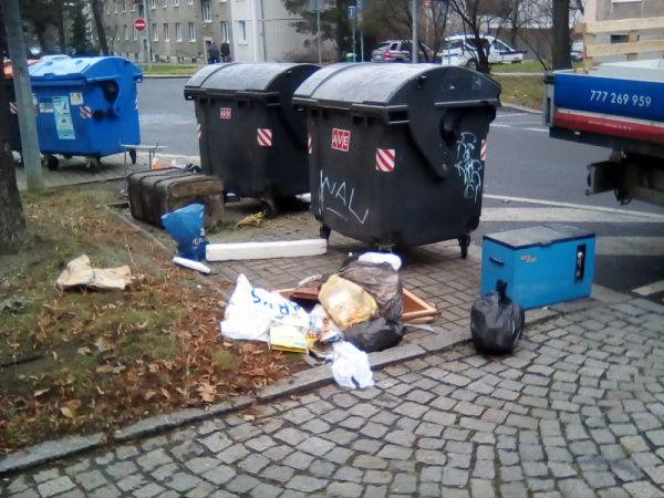 Nepořádek kolem kontejnerů na směsný odpad Pod lipami 55