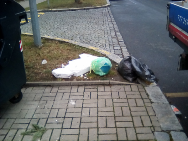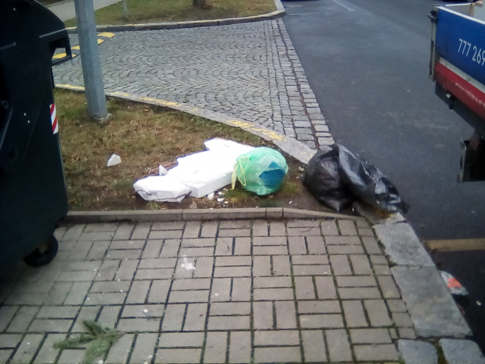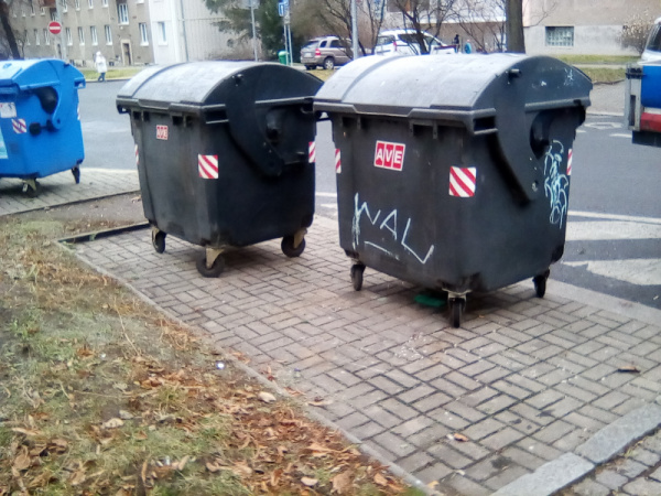 Těžkej kus zdiva u popelnice.
