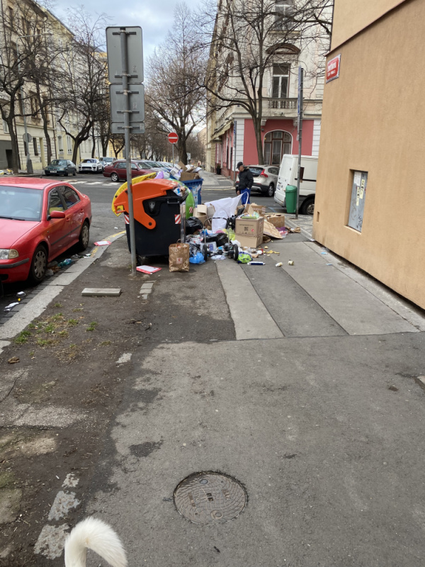 Kolem popelnic je hromada papiru a ruzneho bordelu ze se sotva projde.