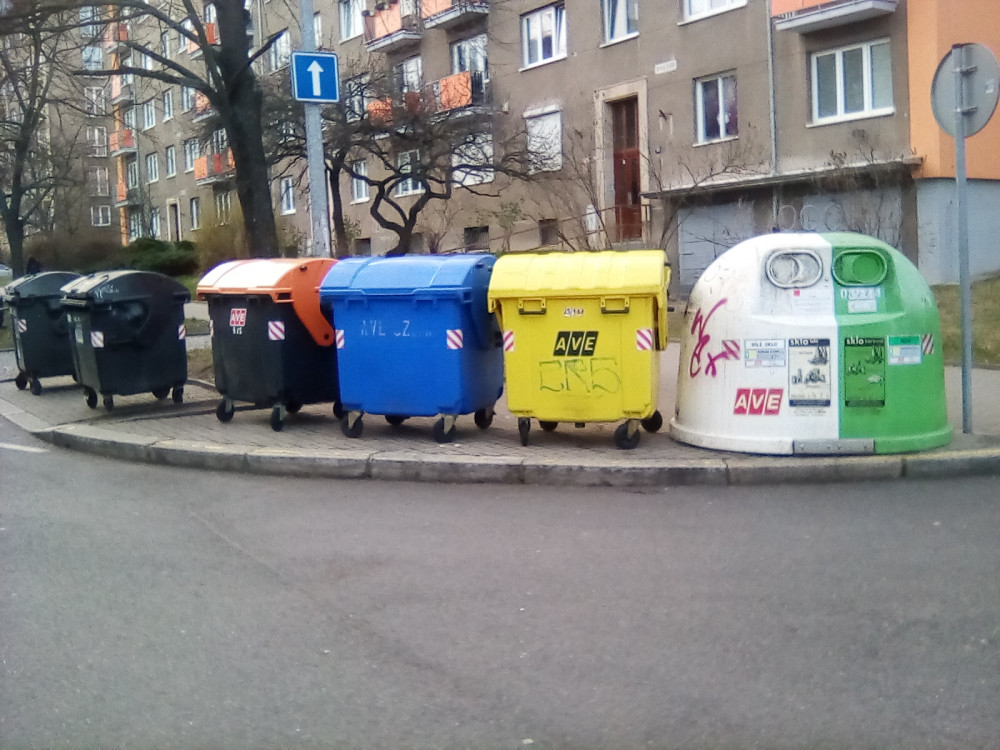 Kolem sběrných nádob kusy starého nábytku a hadry.