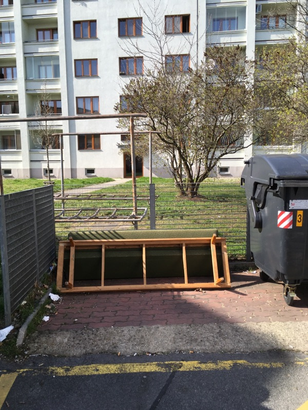 Odložený gauč u kontejneru na odpadky