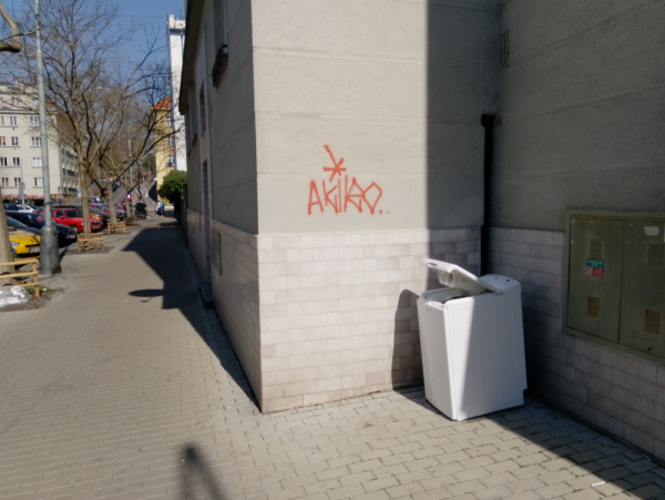 Na rohu ulic Strážní a Biskupcova se objevila patrně stará vyhozená pračka s horním plněním značky Whirlpool. Díky za případný úklid, s pozdravem a díkem Jan Hrudka