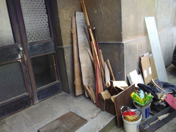 Skládka prken a jiného nepořádku.