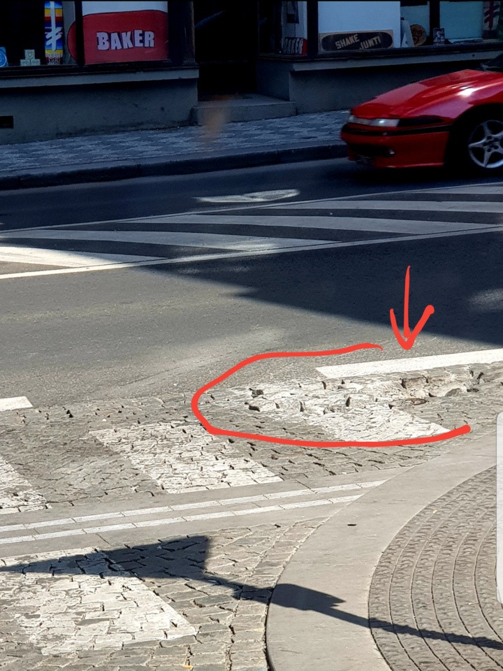 Orebitská/Husitská - rozpadlé dláždění vozovky