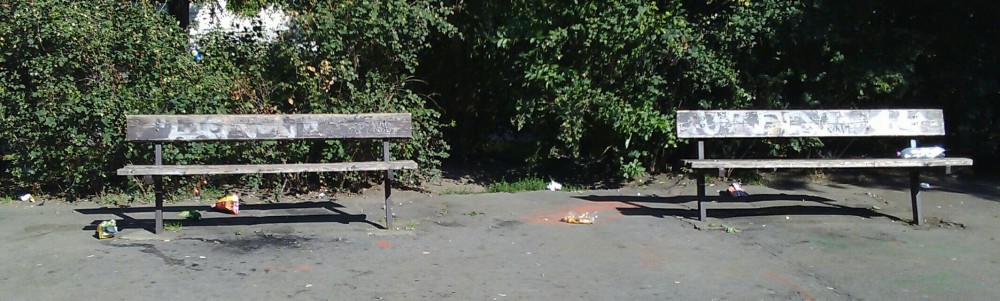 Spousta odpadků poházených okolo laviček, v zeleni a širokém okolí.