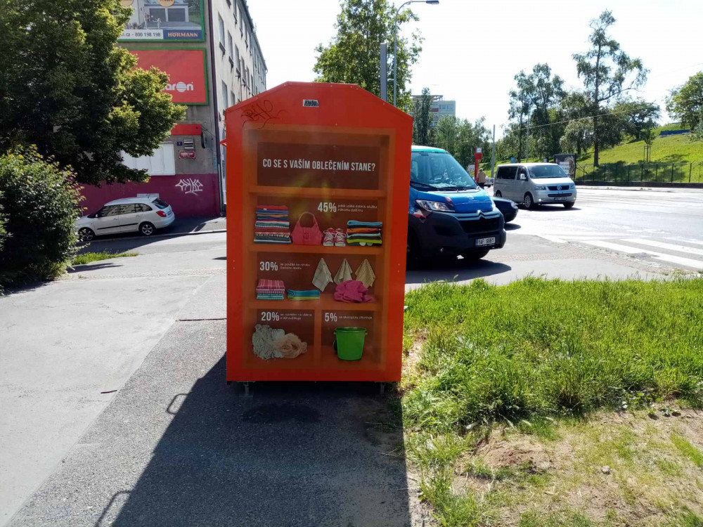 Trvale poházené odpadky, krabice, části oděvů a pleny invalidních bezdomovců nacházející se v Koněvově ulici u rohu paneláku U kněžské louky 1.