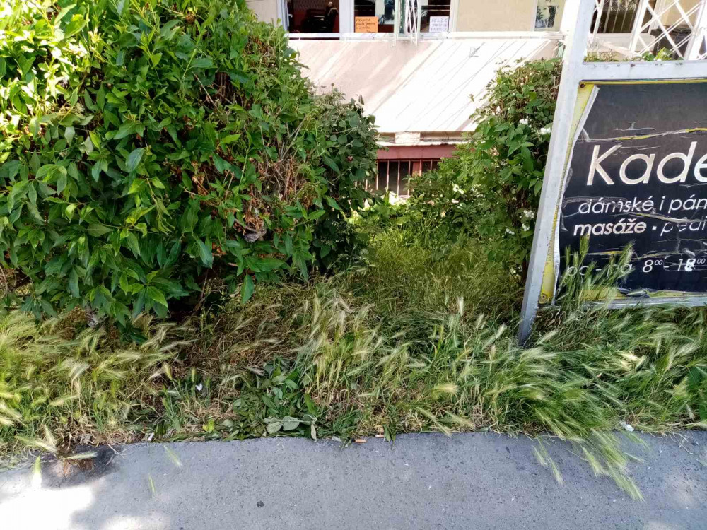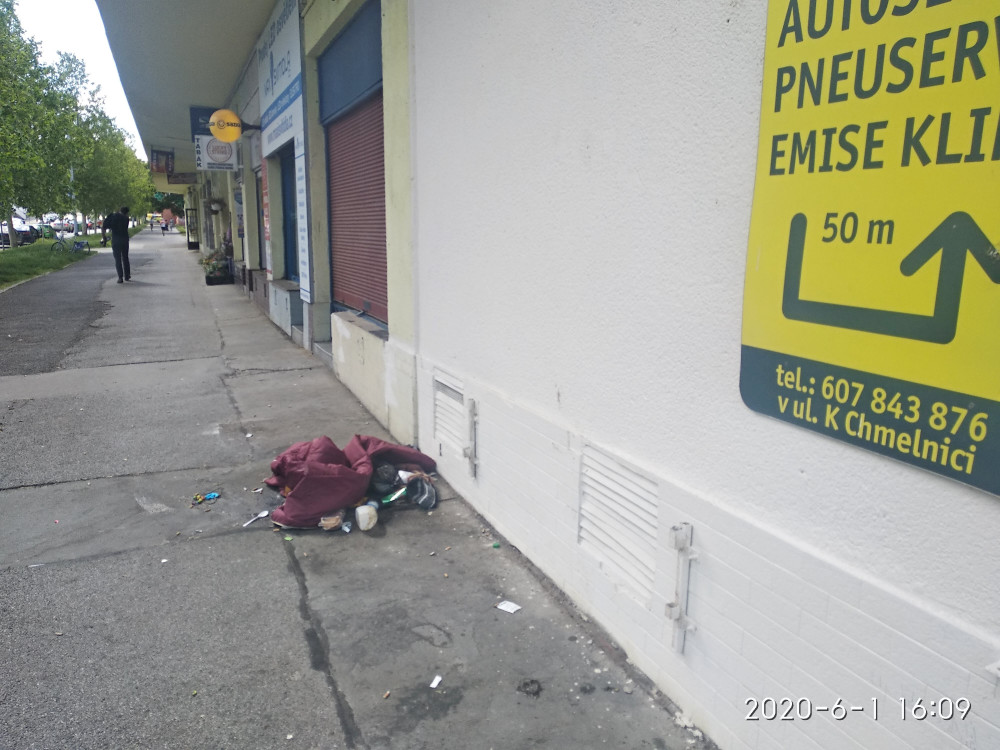 Zatouchající odpad, peřiny, tašky po bezdomovcích na rohu Koněvovy a U kněžské louky před trafikou a v okolí