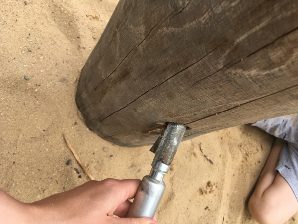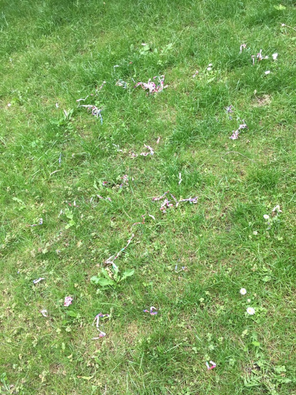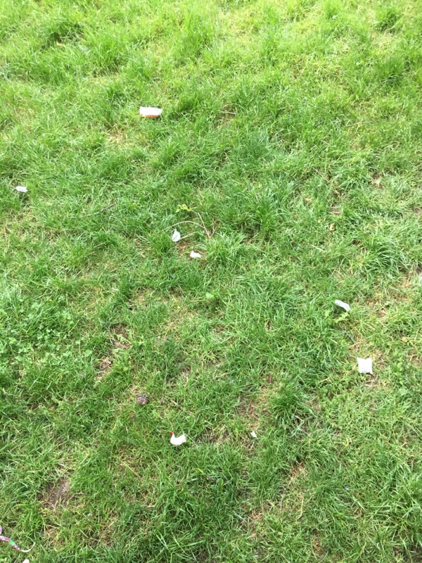 Rozbita prolezacka (lano na chozeni nedrzi v sloupu), neporadek (papiry) na travniku nad timto hristem