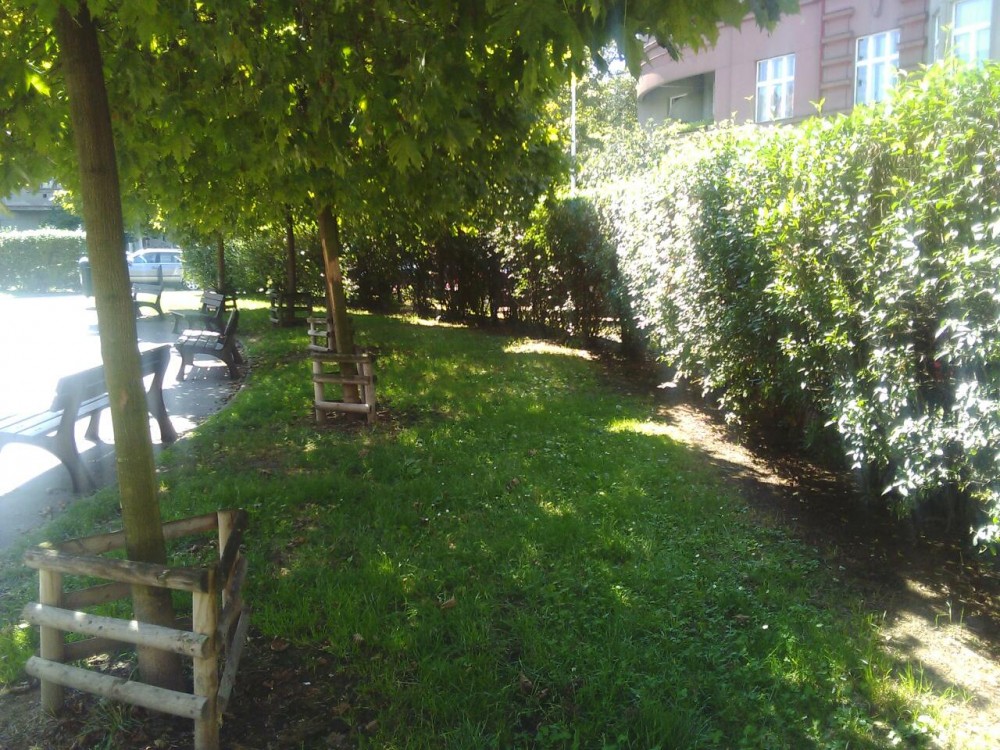 Škroupovo nám.: prosím uklidit vnitřní zelený pruh vč. přeplněných odpadkových košů.