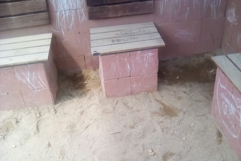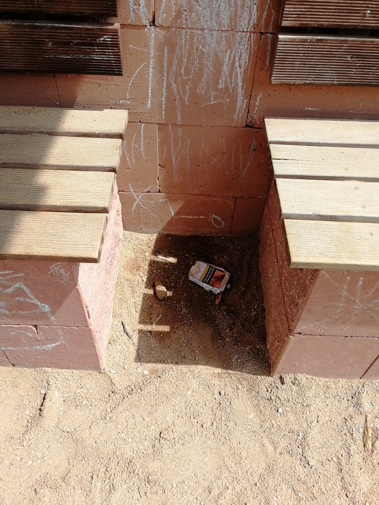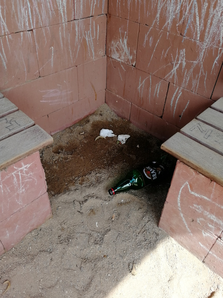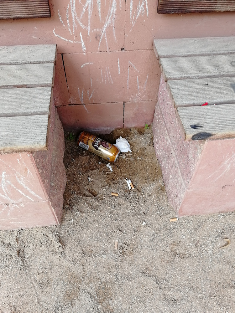 Plechovky a pet lahve od piva, nedopalky od cigaret, krabičky od cigaret. Moč v rohu hřiště.