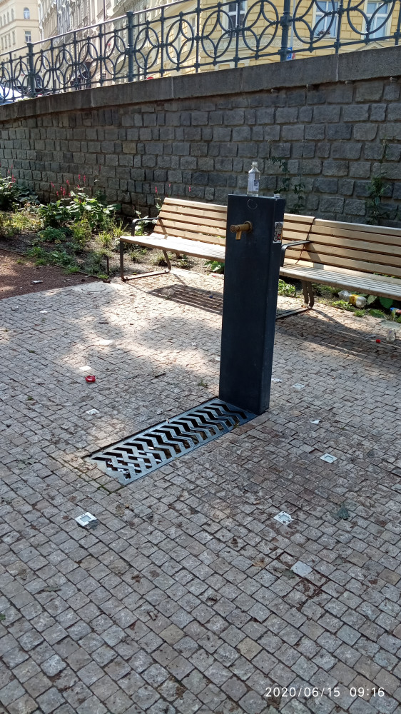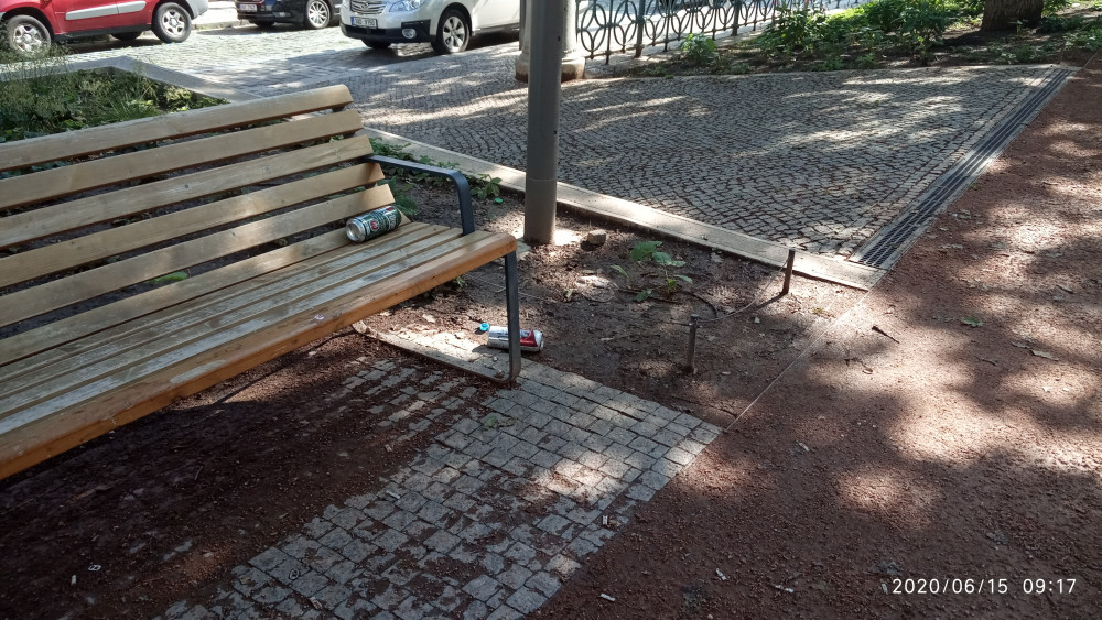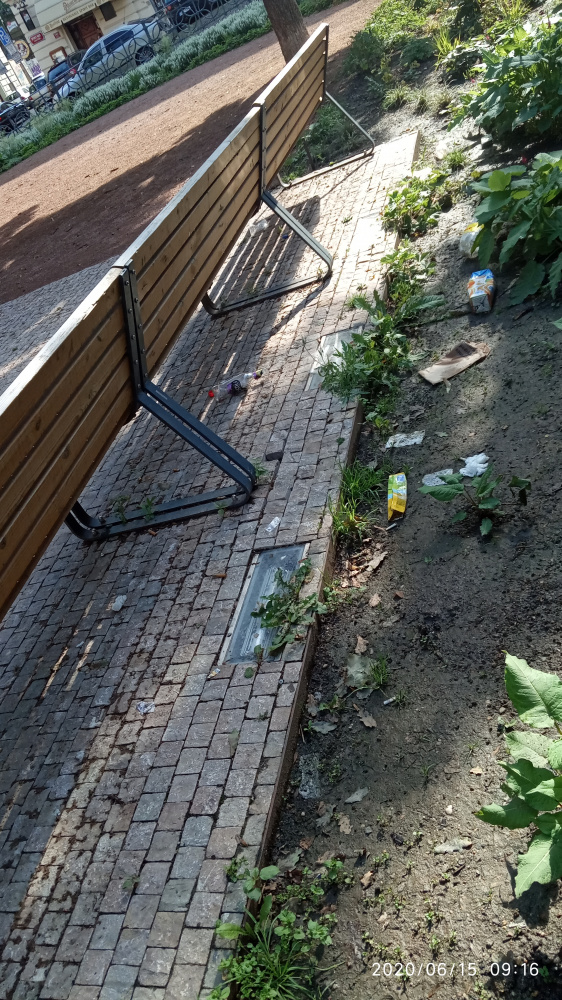 nepořádek v okolí laviček umístěných na Kostnickém náměstí - na zemi odhozené nádoby od nápojů (plastové lahve, plechovky, nápojové kartony), papíry, atp.