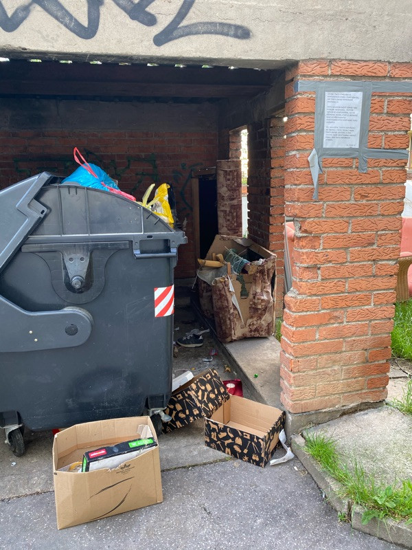 Žádám o odvoz nepořádku u kontejnerů před vchodem Jeseniova 33. Předem děkuji.