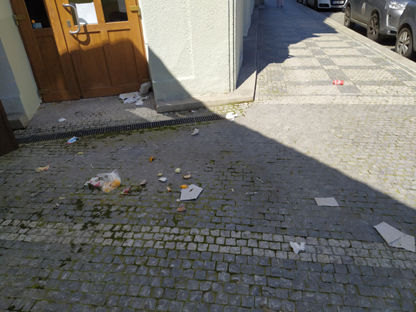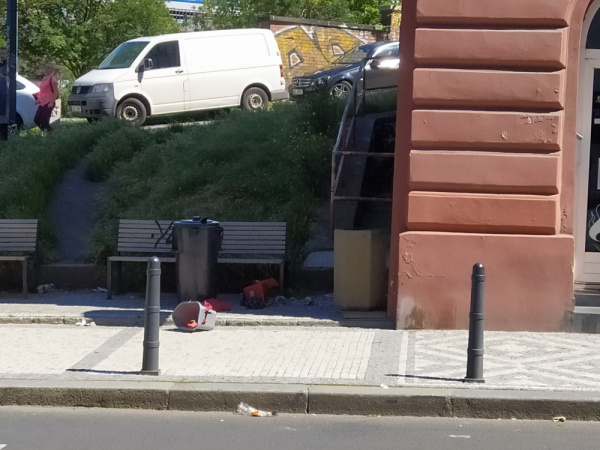 Nepořádek u domu Husitská 32.Bezdomovci od estakády opět rozhrabali popelnice z tohoto domu všude kolem.
