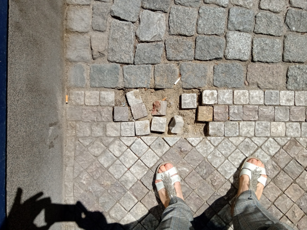Poškozená dlažba na chodníku před domem Husitská 76/27.