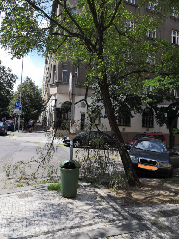 Ulomená větší větev z akátu na rohu ulic Lucemburská a Velehradská. Již cca 4 dny.