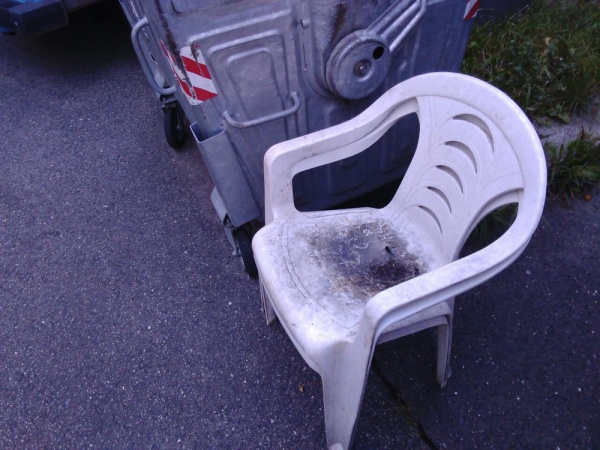 Plastové židle u kontejnerů.