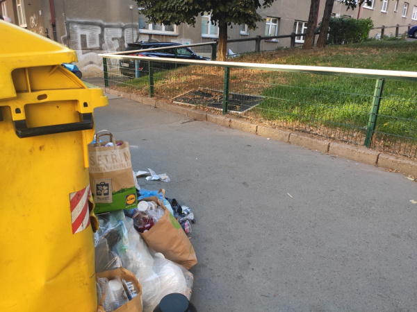 dvojhlášení: nepořádek kolem kontejnerů a rozbité zrcadlo hned naproti