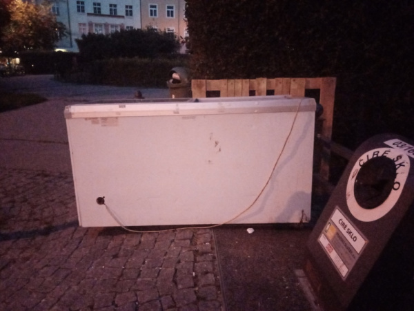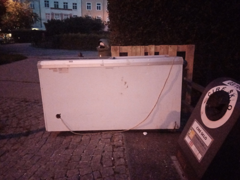 děkujeme za Váš podnět. Mrazák je již pryč. Podzemní kontejnery má jinak v péči firma AVE. Pravidelně vyváží a úklid taktéž zajišťuje v okolí do 3 metrů okolo nádob.