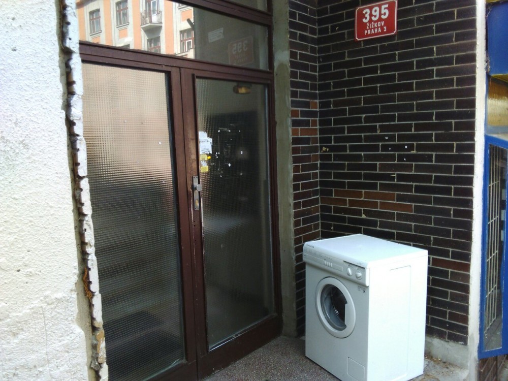 Před domem Ostromečská 5 stojí již tři týdny vyřazená pračka