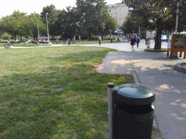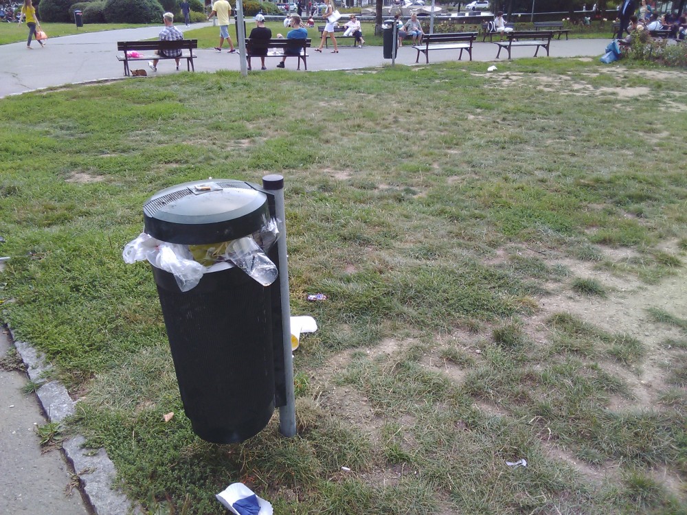 Kontrola košů na Jiřího z Poděbrad. Téměř všechny koše přeplněné.