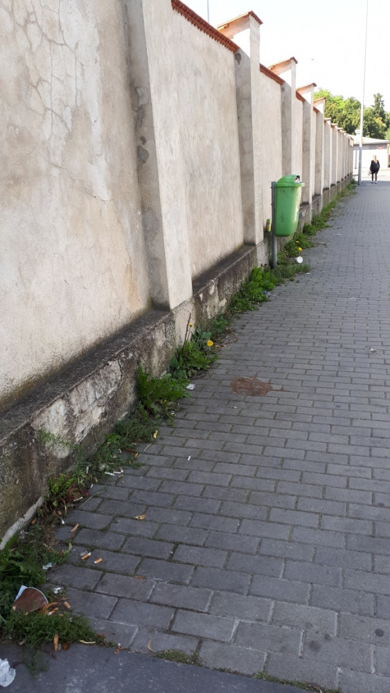 plevel u hřbitovní zdi, všude nedopalky cigaret,přeplněný odpadkovy koš