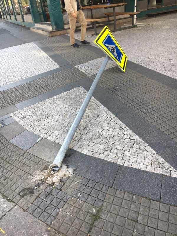 Poškozená dopravní značka, je ulomená a leží na chodníku