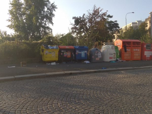 Nepořádek a smard okolo popelnic na směšný odpad.