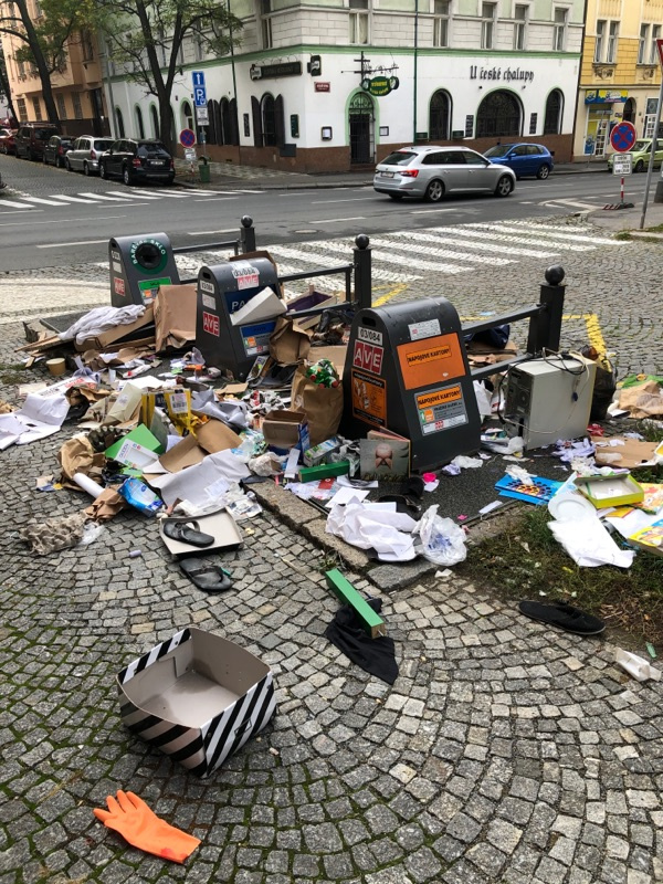 Neporadek kolem popelnic na rohu Hajkova a Konevova.