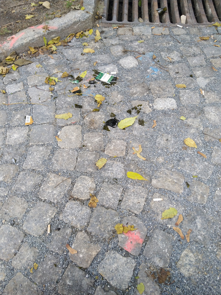 Střepy u lavičky. Druhá lavička stále chybí. ;)