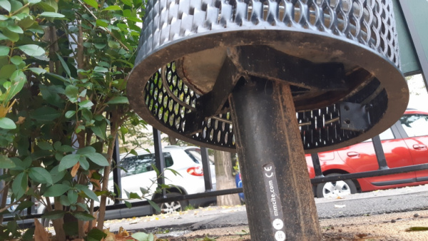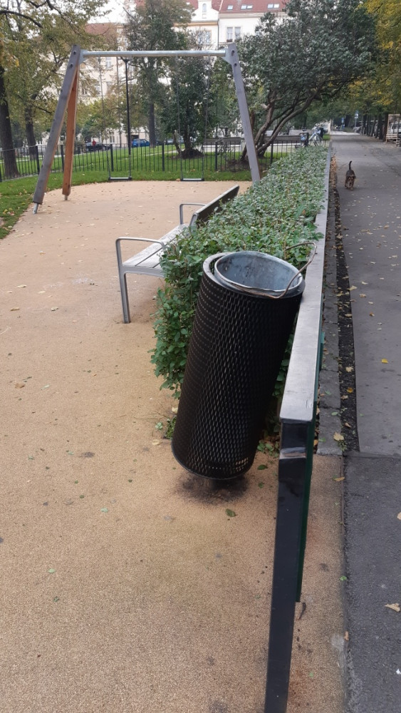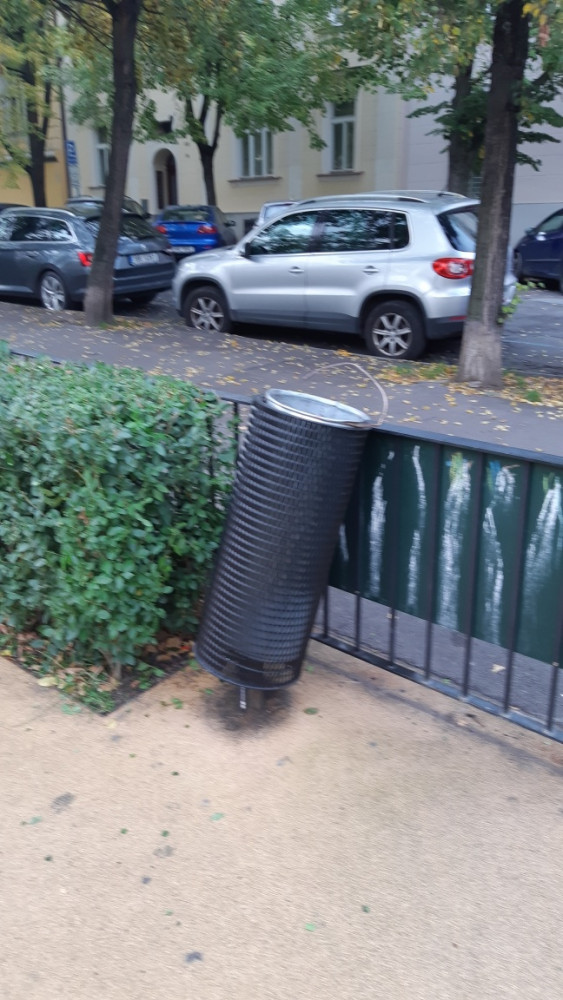 Kos na odpadky nedrzi na kotevni noze - chybi srouby. Detske hriste, nam. Barikad.