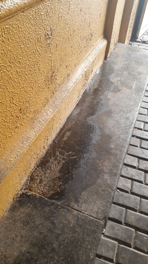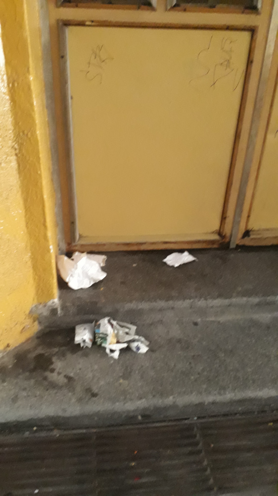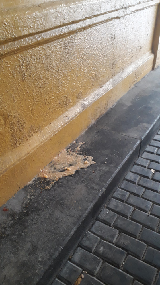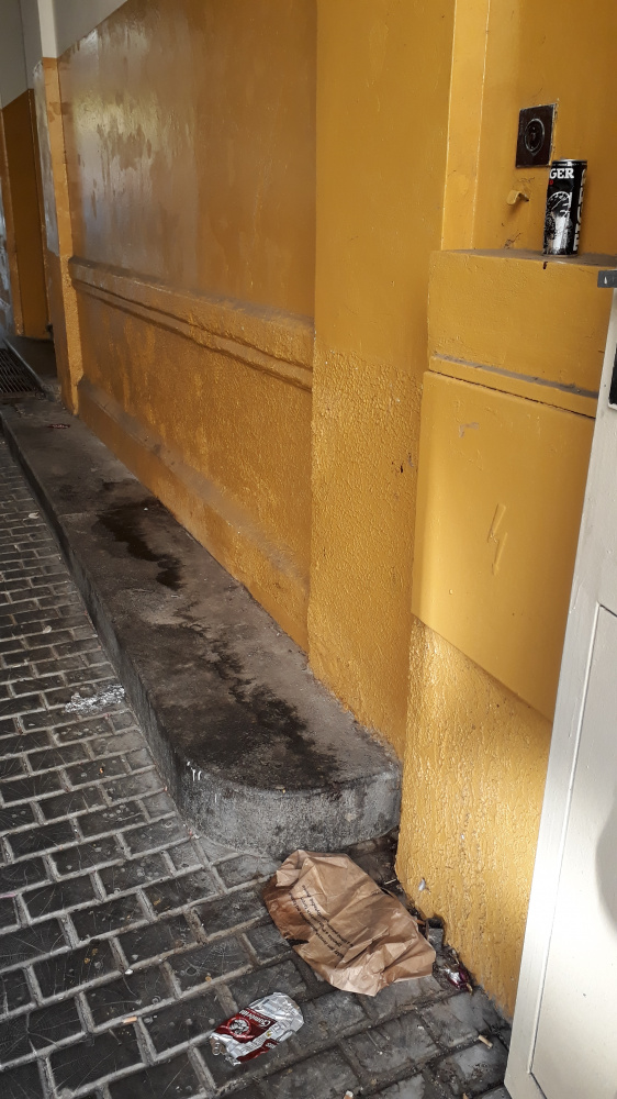 Permanentní nepořádek v průjezdu, vetšinou u vstupu do domu. Tentokrát tradičně namočeno a k tomu zvratky. Nikdo zde neuklízí, je to opravdu nechutné.