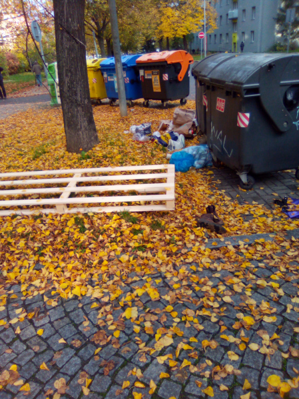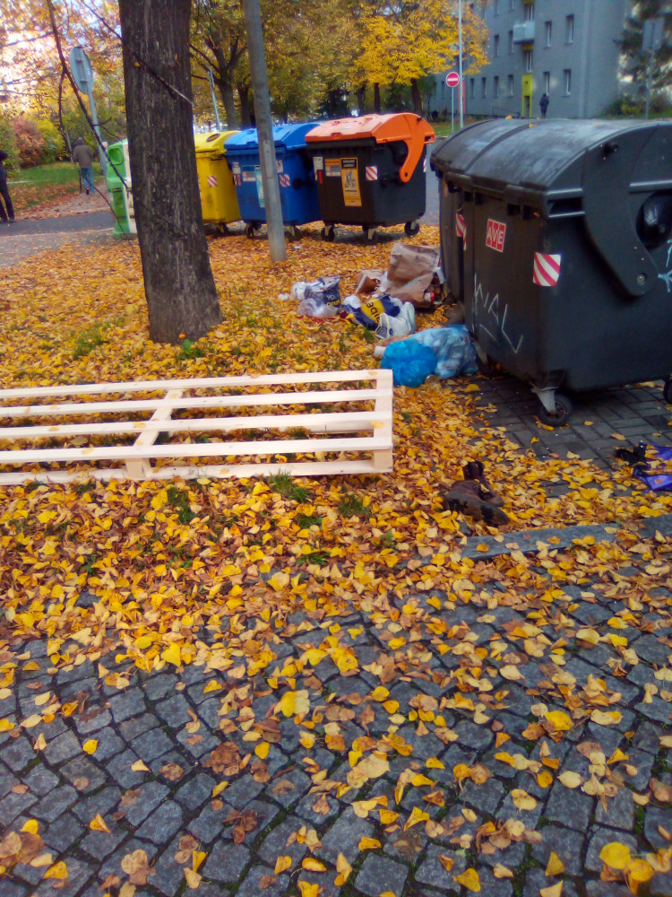 Zbytky postele a další nepořádek u kontejnerů na směsný odpad.