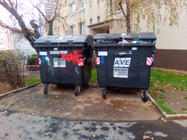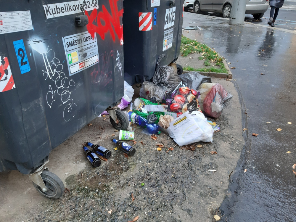 roh Kubelíkovy a Bořivojovy nepořádek okolo kontejnerů