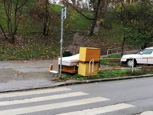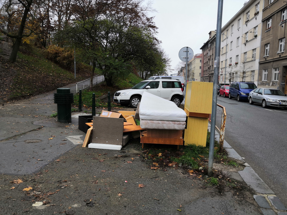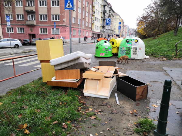 Poblíž kontejnerového stanoviště na křižovatce ulic Jeseniova a Zelenky Hajského stojí už 14 dní několik kusů starého nábytku.