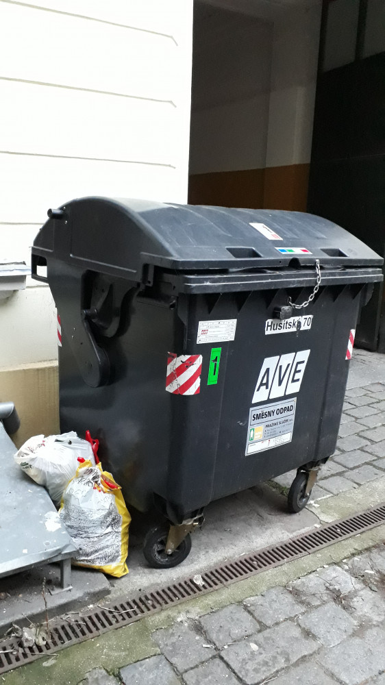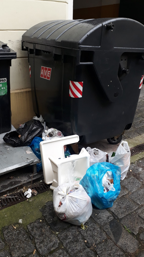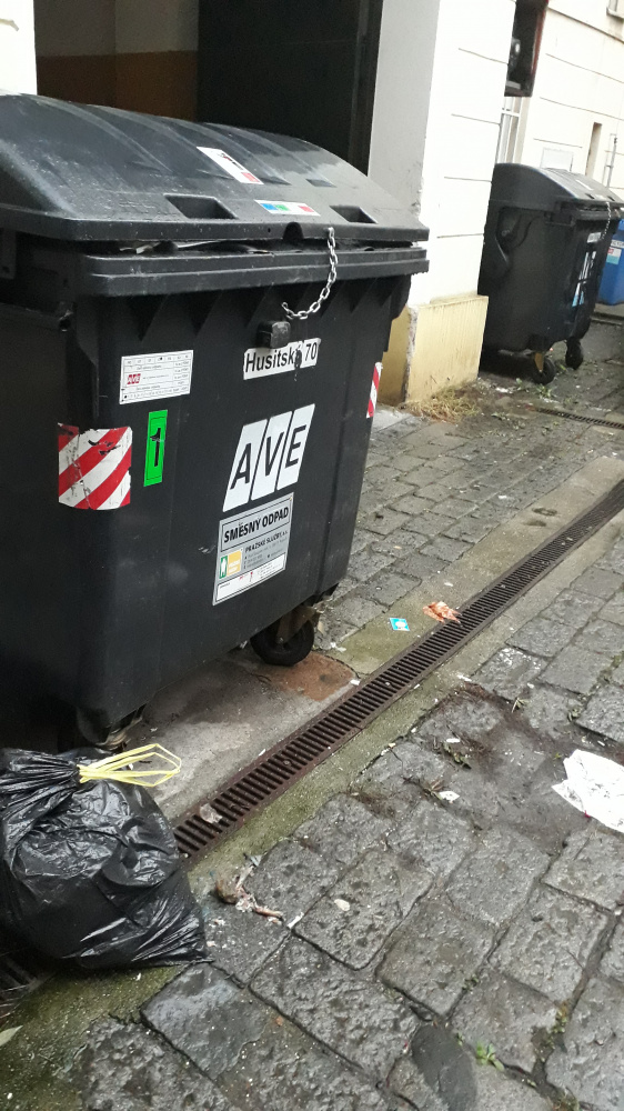 Stabilní nepořádek v průjezdu a na dvoře u kontejnerů. Možná by pomohlo rozdat všem nájemníkům klíč od kontejneru a naučit je jej odemykat a zamykat?