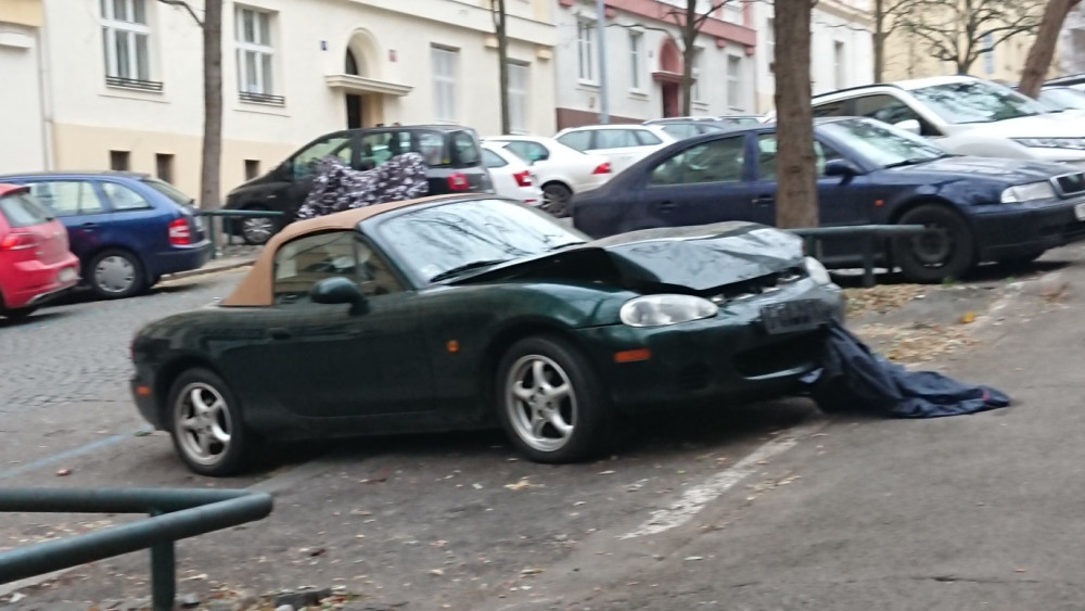 Dobrý den, vím že to sem asi nepatří, ale třeba to předáte na správné místo - na Baranově ulici stojí už víc než týden bourané auto, zabírá 2 parkovací stání.