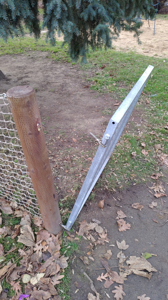 Vrátka u vstupu do venkovní posilovny z hřiště Na Balkáně jsou vyvrácená a trčí z nich ostrý šroub.