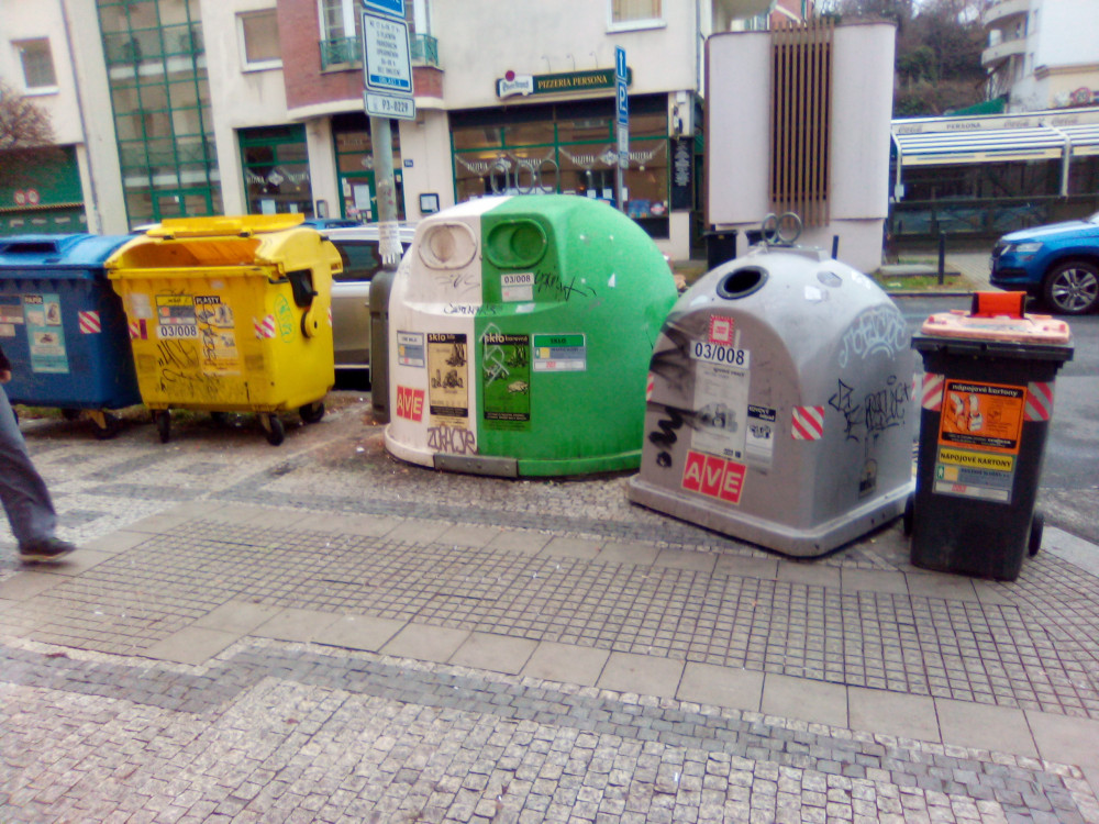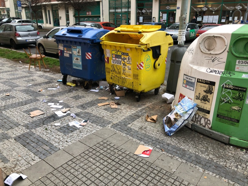 Nepořádek kolem popelnic tříděného odpadu po odvozu