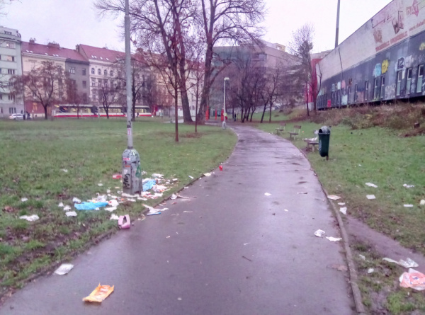 Cca před týdnem došlo k vysypání jednoho z košů na odpadky u lampy v parku. Od té doby zůstává nepořádek neuklizen.