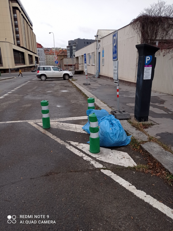 u parkovacího automatu před vstupem do areálu RIAPSu, Chelčického 39, jsou 2 - 3 modré pytle, které tam již několik týdnů zanechali řemeslníci opravující na podzim střechu ZŠ Chelčického 43 [investorem byla MČ Praha 3 !!! ]. Děkuji za Vaši pomoc.