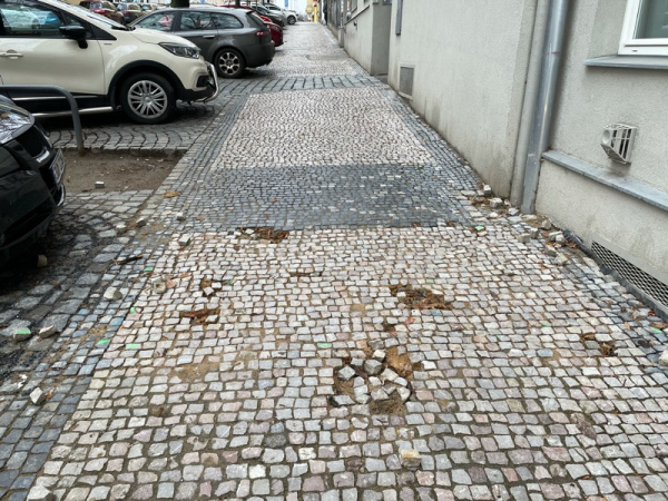 Prosím o opravu chodníku. Je to zde chronický problém. Uvolní se jedna kostka a do týdne se to začne rozpadat celé. Aktuálně jsou kostky vypadané na několika místech viz foto. Díky.