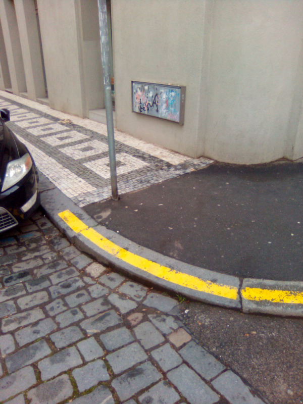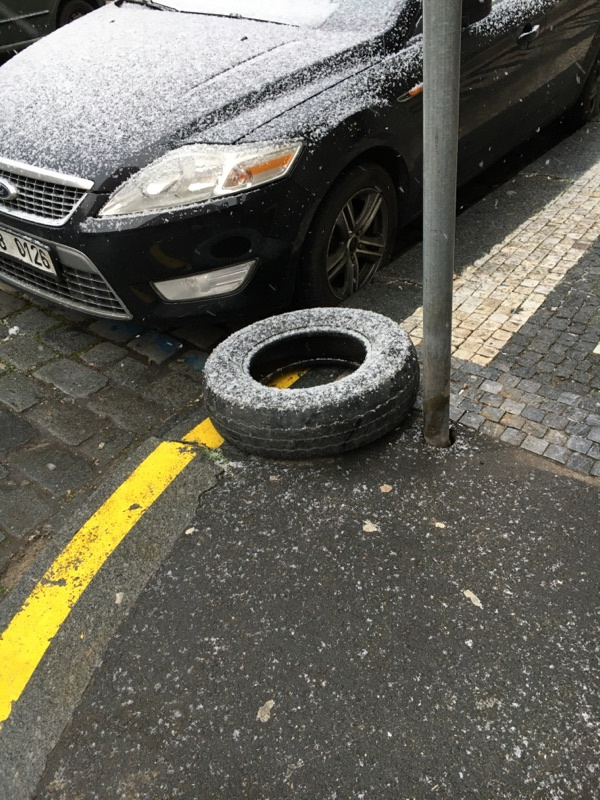 Pneumatika na chodníku, roh Chlumova a Roháčova