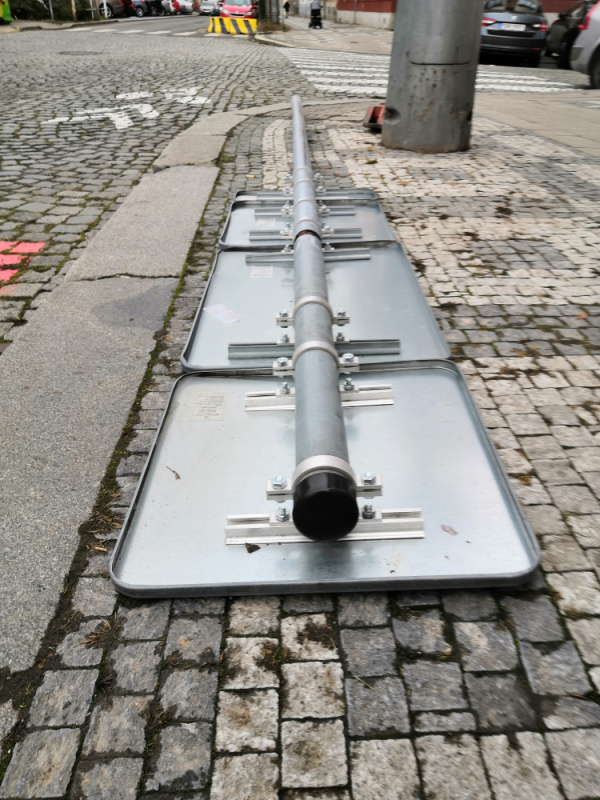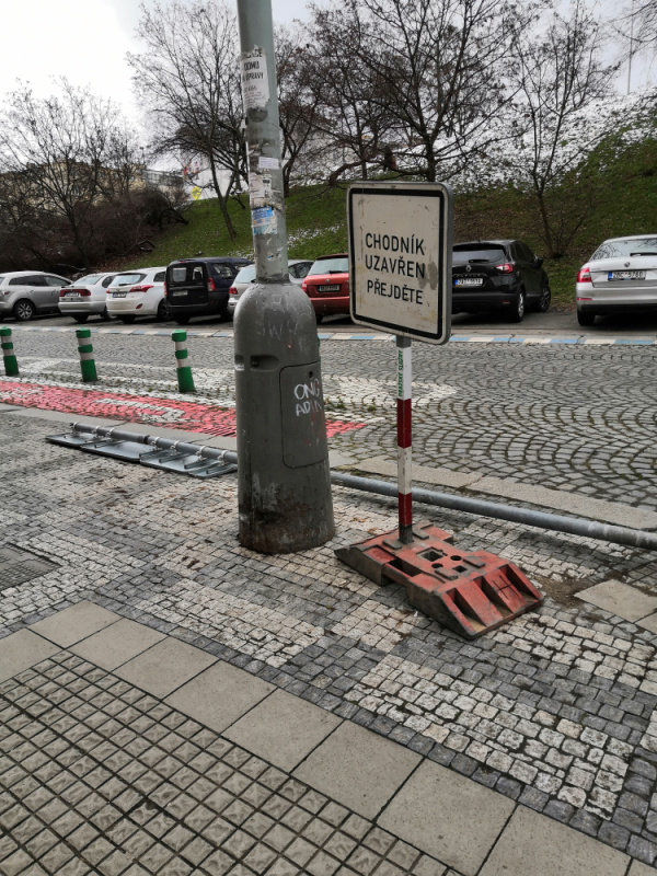 Vzhledem k tomu, že na chodníku nebyly ještě ukončeny všechny údržbové práce a nedaleko je i cedule, že chodník je uzavřen, takže na něm chodci momentálně nemají co dělat, kterou bohužel někdo posunul k okraji a chodník je neoprávněně užíván, je takto "odložená" značka v pořádku". Stavební firma o značkách ví a čeká na vhodné počasí k dokončení prací.