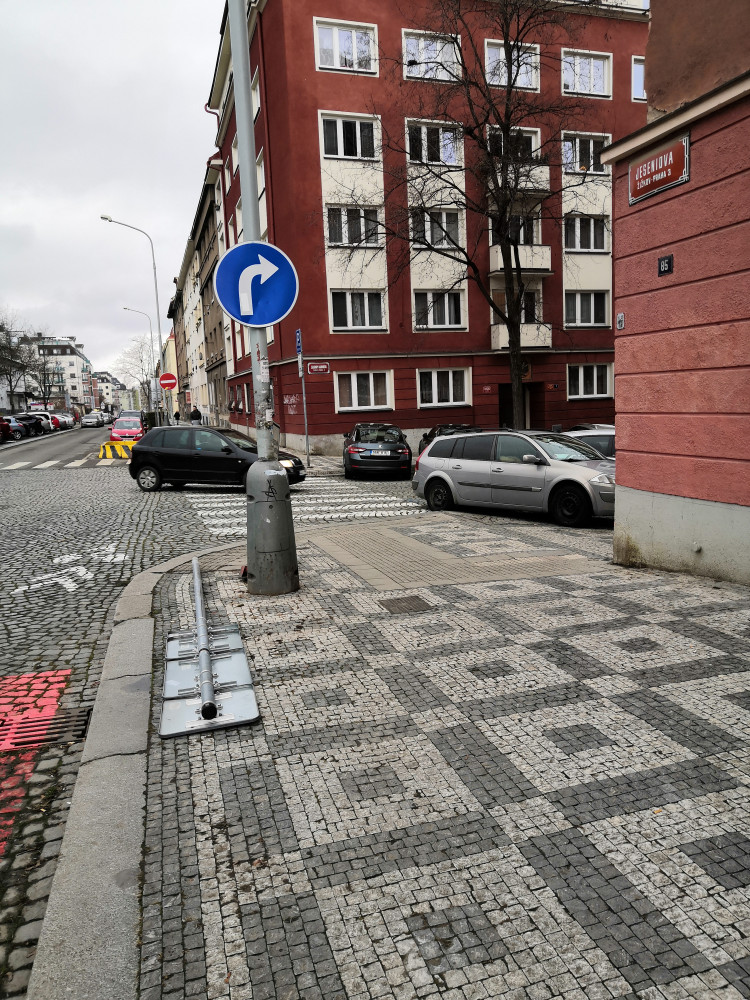 Na křižovatce ulic Jeseniova a Zelenky Hajského leží na chodníku poražená dopravní značka, která překáží chodcům.