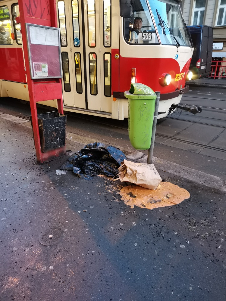 Nepořádek kolem odpadového koše přímo na zastávce Lipanska
