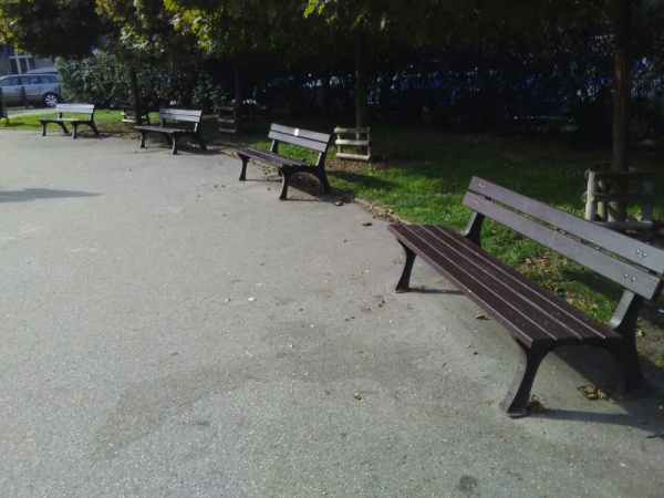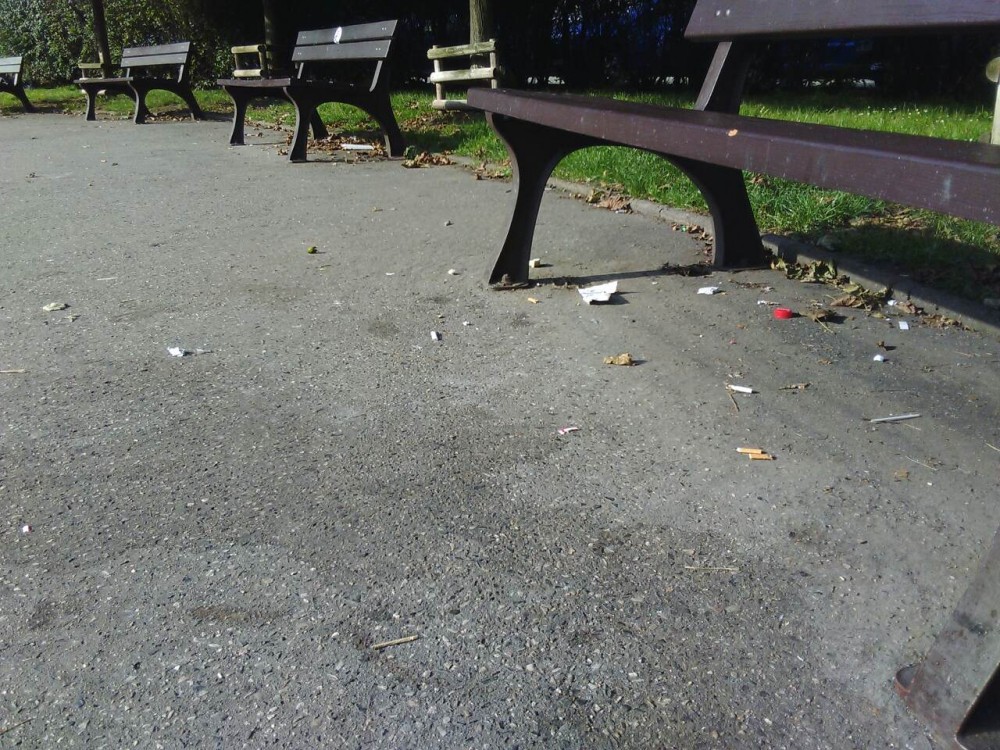 Odpadky po víkendu: vnitřní zelený pruh s lavičkami.